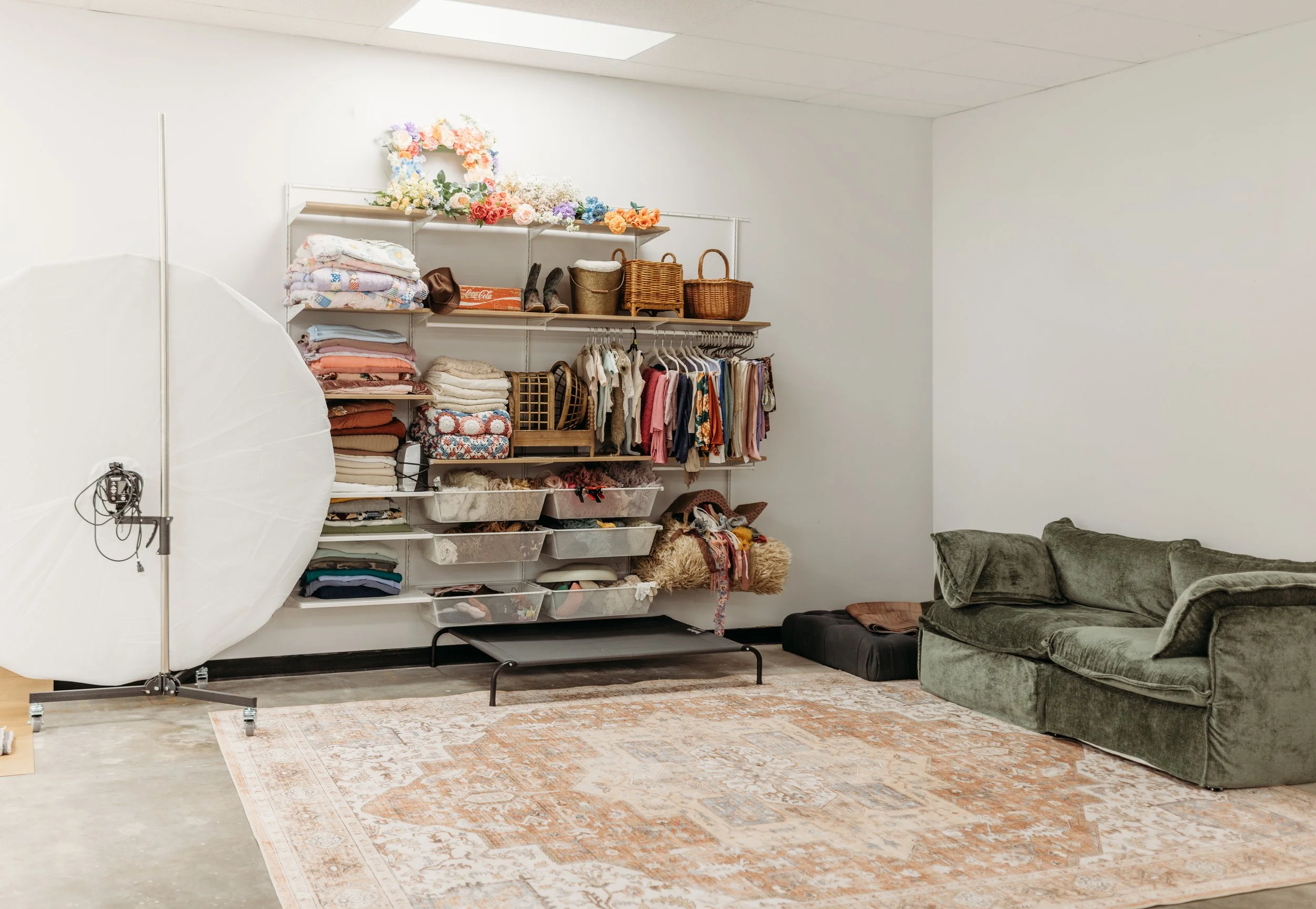 Can we use everything in the space?Everything in the front half of The Portrait Room is free to use for everyone. The newborn area and props are for guests that have monthly memberships with us or pay an extra fee to use.